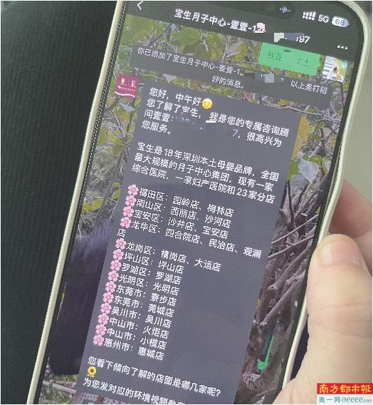 无独有偶,记者在宝安区妇幼保健院走访时也目睹了外部机构的推销行为,推销人员以30-50岁女性为主,几人同时“出没”,一人向候诊孕妇搭话时,其余推销人员会在旁边“盯梢”。记者在现场见到有宝妈不堪其扰,最终无奈添加微信。走访过程中,有不少候诊孕妇向记者表示,自己曾多次被推销月子中心服务,对方常反复要求加微信,“不加不罢休”。