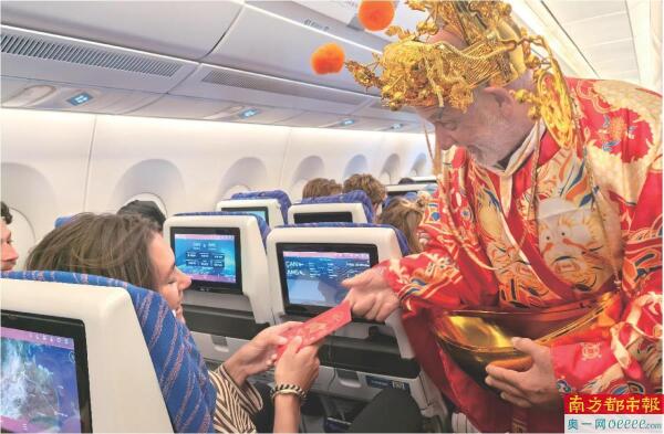 春运出行处处充满“中国年味”。近日,由广州飞往荷兰阿姆斯特丹的中国南方航空CZ307航班上,一位外籍旅客身穿“财神爷”服装,手捧金元宝向每位旅客派发红包,大声说着“新年快乐、恭喜发财”,现场旅客纷纷伸手接礼物,客舱内充满了欢声笑语,在万米高空一同庆祝中国春节。