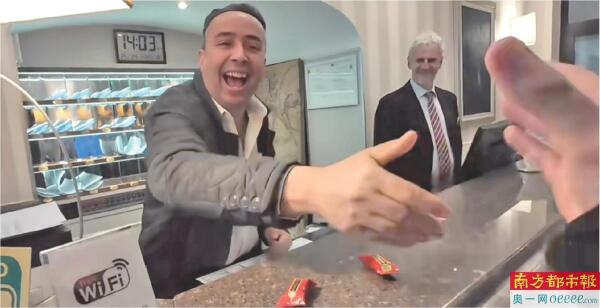 米兰小哥卡雷姆(Karem)收到酥心糖后跟中国游客握手致谢。 视频截图