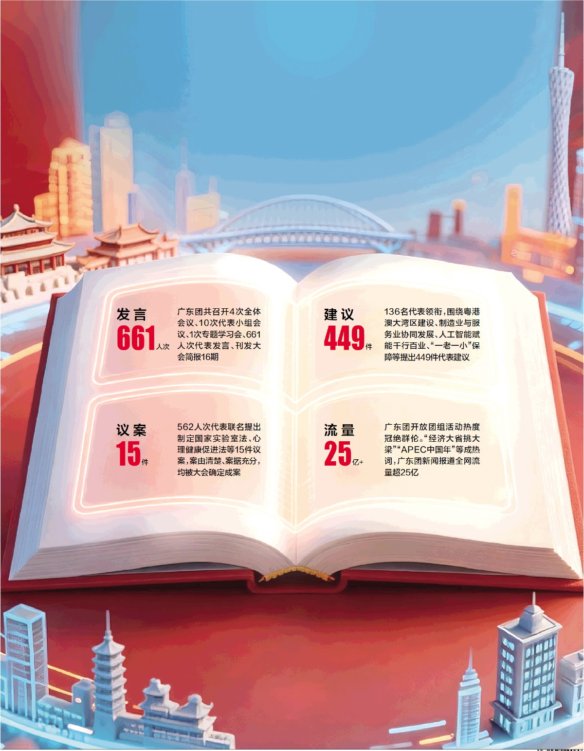 136名代表领衔,围绕粤港澳大湾区建设、制造业与服务业协同发展、人工智能赋能千行百业、“一老一小”保障等提出449件代表建议
