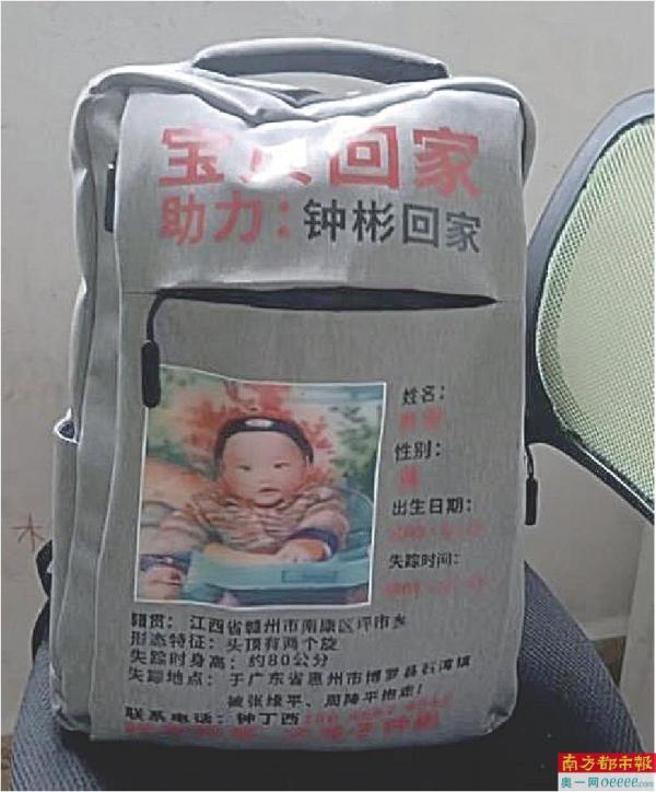 寻子时,他总背着一个灰色“寻子”背包,上面印着“钟彬回家”与孩子的具体信息。他曾告诉南都记者,寻子路上,他会在当地发发寻人启事、开开直播,“大海捞针也要去捞一下”。