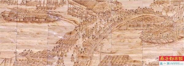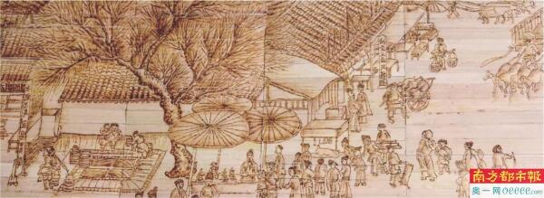大型葵贴烙画《清明上河图》,由2750片10厘米×0.8厘米的葵叶粘贴成画心,再进行手工烙画制成。