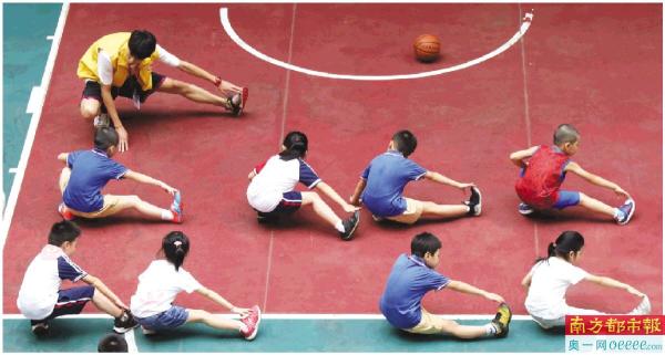 7月19日,广州市小北路小学天香校区暑期校内托管服务开启,孩子上体育课前热身。