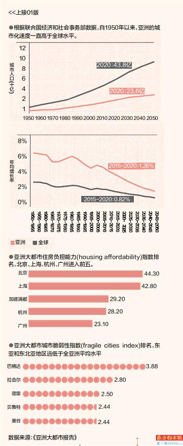 亚洲城市发展速度在全球首屈一指。《亚洲大都市报告》披露,亚洲28个大都市空间的平均人口为881万人,比全球平均水平(621万人)高出260万人。世界大都市协会亚洲会员城市中,德里以3029万高居榜首,上海、北京次之。
