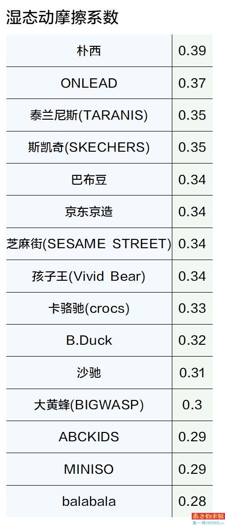 防滑性能方面,15款儿童洞洞鞋样品的湿态动摩擦系数介于0.28~0.39之间,其中湿态动摩擦系数最小的三款品牌样品分别为balabala、MINISO、ABCKIDS,系数分别为0.28、0.29、0.29。