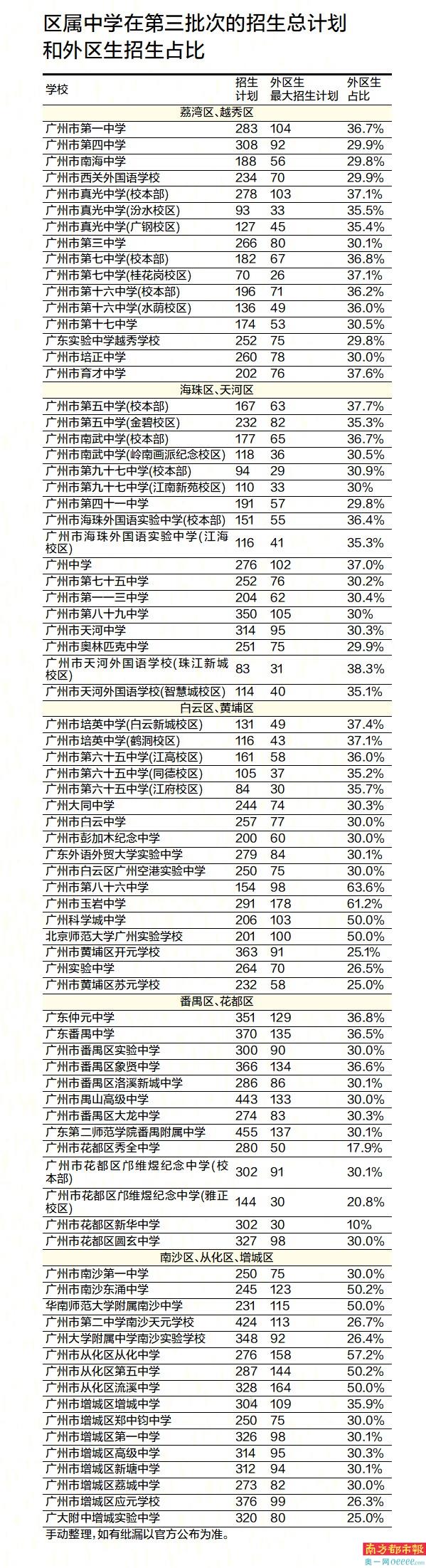 对外区生报考难度的想象,不少家长是基于外区生名额与本区生名额比例的考虑。据粗略统计,广州市有外区招生计划的学校接近80所。
