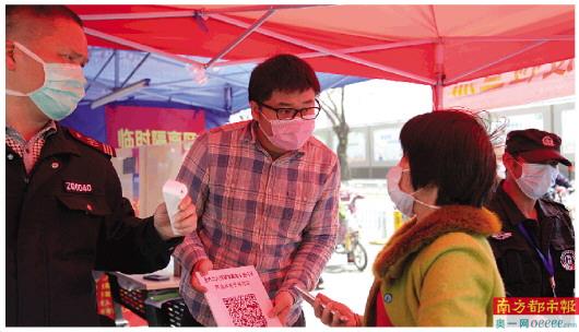 工作人员在福昌小区入口处为居民测量体温,并要求扫码检查通行证。