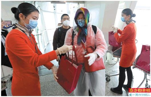 2020年4月8日。离汉通道开放首日。10时许,东航MU2477次为落地深圳的首架客运航班。深圳机场为乘客送上口罩、洗手液等小礼品。 宝安通记者 赵炎雄 摄