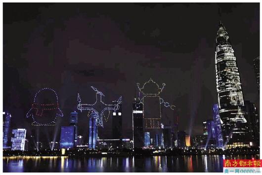 腾讯QQ、大疆无人机等南山文化科技企业经典元素亮相深圳经济特区四十周年灯光秀。 南都记者 霍健斌 摄