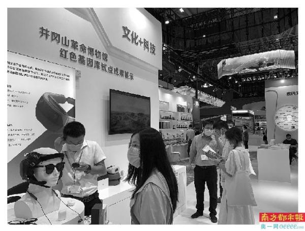 在10号馆的新疆展厅,记者同样看到不少红色元素,如新疆塔克拉玛干文化传媒演艺有限公司的《三五九是模范》实景演出的推介,新疆生产建设兵团多个红色主题招商项目;在陕西省展厅,“红色南泥湾 陕北好江南”成为一大看点;在9号展馆的江西省展厅,井冈山革命博物馆红色基因库试点成果展示,令人耳目一新,红色基因与科技联姻,成为新的吸睛点。