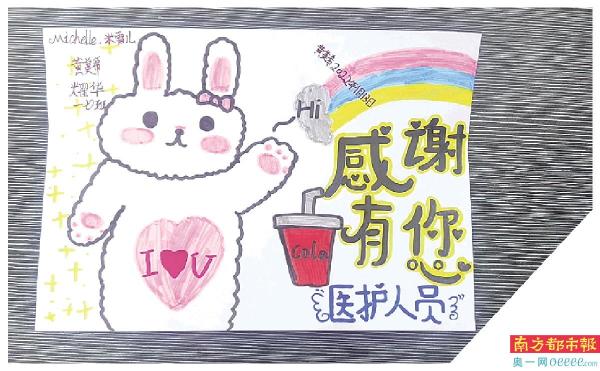 与任思齐想法相同的少年,还有一年级的黄美希和同龄的小暖男左可洋。“医生你们辛苦啦!我画的画送给你们,给你们加油!”在孩子的画中,世界是由童话组建的,紫荆社区的黄美希将自己比喻为小白兔,画中带着最喜欢喝的可乐为医务人员送去彩虹和感恩。