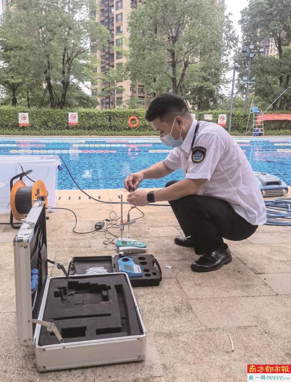 卫监工作人员对游泳场所进行水质抽检。