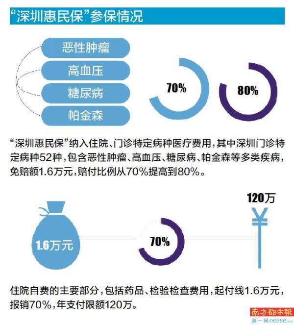 “深圳惠民保”坚持“普惠”定位,不仅扩充医保目录内的保障,更大幅提升医保目录外自费方面的保障水平。在医保目录内保障方面,“深圳惠民保”待遇一纳入住院、门诊特定病种医疗费用,其中深圳门诊特定病种52种,包含恶性肿瘤、高血压、糖尿病、帕金森等多类疾病,免赔额1.6万元,赔付比例从70%提高到80%。