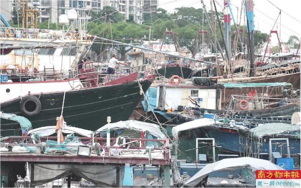 8月31日,台风“苏拉”登陆前夕,深圳蛇口渔人码头里的渔船停靠在岸边,渔港中心公园张贴着因天气原因闭园的告示。 南都记者 霍健斌 摄