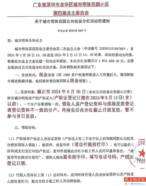 城市明珠业委会公众号消息,根据业主大会的决议和授权,本次分红金额共计约184万元。发放形式为现金发放,发放对象是截至2024年6月30日(本次公共收益分发截止日期)持有城市明珠房产的产权证人(产权证登记日期在2024年5月13日(含)以前),一个分户仅限领取一次。业主需携带相应材料,首日现金领取时间在6月10日下午,6月30日截止,截止日后仍未领取的应当视为放弃权益,未领取资金默认存入业主大会基本账户,属于全体业主公共收益。