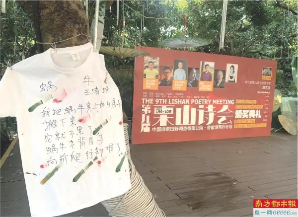 在有深圳最美“森林图书馆”之称的深圳福田区儿童图书馆香蜜分馆,诗人们在图书馆前荔枝树上挂的白色T恤上写诗,诗句随风飘扬。图书馆四周布置的周艺文童话作品里的人物雕塑,也穿上了写满诗歌的白色T恤。沿着上坡的栈道,读者与游客被栈道两边的诗歌吸引住了,他们读到了3岁至17岁孩子的诗与本次获奖诗人、批评家、翻译家的诗。