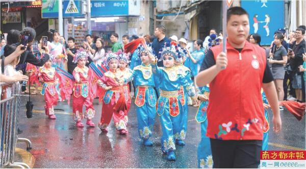 巡游庆典,萌娃与围观市民互动。 资料图