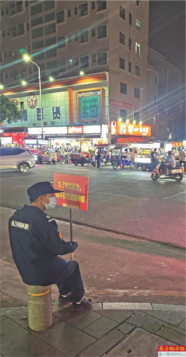 但“制服人员”就只站在原地举牌,并没有对移动摊贩进行任何劝导,对现场出现的各种不文明行为视而不见,不管是移动摊贩占据斑马线摆卖,还是摊贩将小餐桌支在机动车道上,他们一样熟视无睹。南都记者当晚还看到,有一名制服人员拿着牌子坐在绿化带上休息,而他前面就有食客坐在机动车道上的小餐桌前吃饭。摊贩似乎与他们也达成了一种奇怪的“默契”,只顾着忙活着手里的生意。