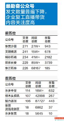 4月,“东莞沙田”发布271篇文章,反超“东江石排”和“文明横沥”公众号,跃居榜首,而“欢乐长安”公众号也以229篇文章成功进入榜单前五。记者查看这几个公众号发现,4月因疫情情况有所好转,企业陆续复工复产,大部分公众号的推文都以企业复工情况、直播带货、学校开学时间等内容为主,开始逐步恢复推送民生类内容。