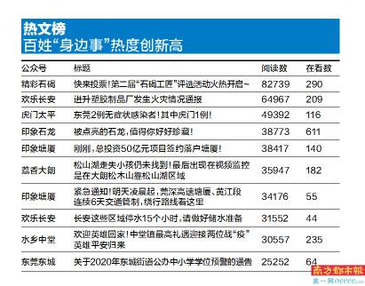 实际上,从这期榜单来看,热度靠前的推文都是与百姓息息相关的,而且热度都比之前的榜单要高很多。就拿排名第十的由“东莞东城”公众号发布的《关于2020年东城街道公办中小学学位预警的通告》来说吧,阅读数是25252,是往期热文榜排名前三的成绩。