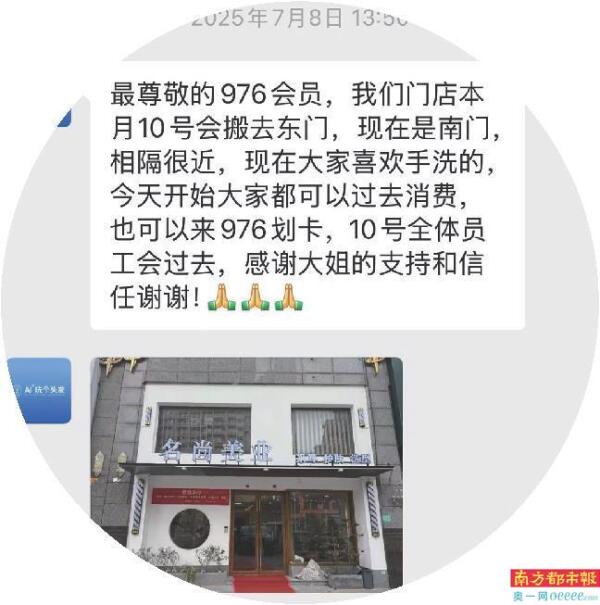 然而,两天后,对方发来一条微信称:“门店本月10号搬去东门;大家喜欢手洗的,今天可以过来消费。”对方还发来一张新门店的照片,上面显示店名为“名尚美业”。对方还表示,是搬过去合并一起营业,“不需要你们另外加钱”。
