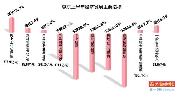 分析认为,今年上半年,惠东县农业生产总体平稳。农林牧渔业总产值75.8亿元,增长3.8%。工业生产加快增长。今年上半年,全县规上工业总产值275.9亿元,增长13.4%,增速分别比一季度、1-5月提升3.0个和0.9个百分点;规上工业增加值增长12.8%。