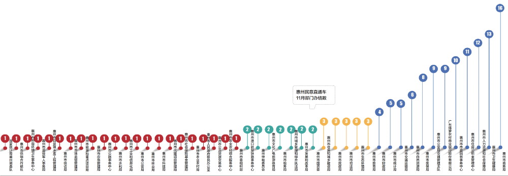 与10月情况高度相似,大量职能部门的月度办结量仍处于低位。惠州市文化广电旅游体育局、惠州市教育局、惠州市住房和城乡建设局等多个部门办结量仅为个位数,仍有如惠州市委组织部、市农业农村局等22个单位月办结量为1件。这持续表明,在驱动更广泛职能部门常态化、机制化参与民生诉求响应方面,有待加强。