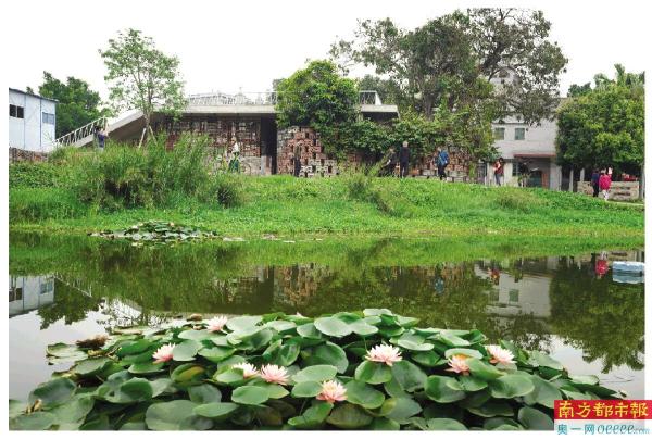 在碉楼后面的小池塘边,一座由旧砖瓦砌成的网状环形建筑吸引不少游客停下拍照,这便是当地有名的“网红厕所”。