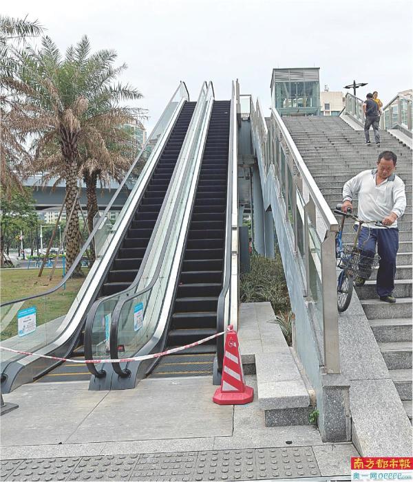 5月10日,城轨珠海站人行天桥靠近昌盛路一侧2台自动扶梯暂停使用。