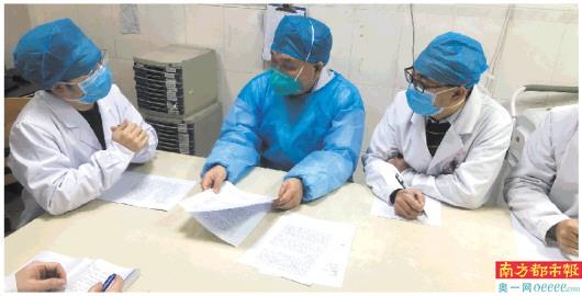 身穿蓝色隔离服的覃铁和,和一线医生在商讨患者的病情和救治方案。