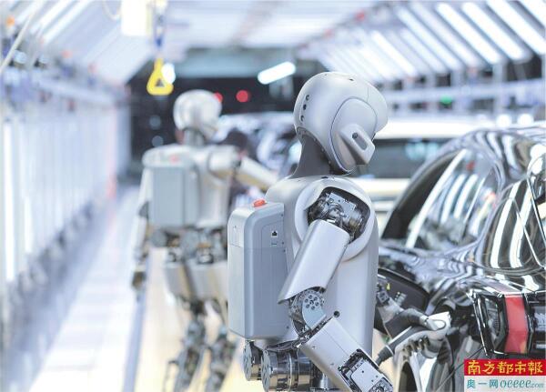 优必选工业人形机器人“群体智能”在极氪5G智慧工厂开展协同实训。 南方日报记者 朱洪波 通讯员 罗艳 摄
